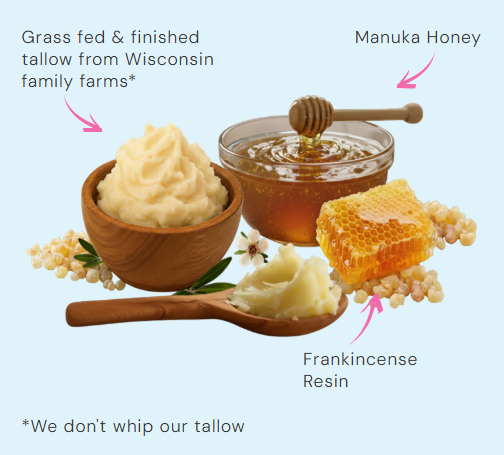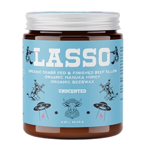 Lasso Tallow is made with grass-fed and finished suet tallow from Wisconsin family farms, Manuka honey from New Zealand, beeswax from Wisconsin, frankincense resin from Oman, and organic essential oils that are gentle and safe for skin.