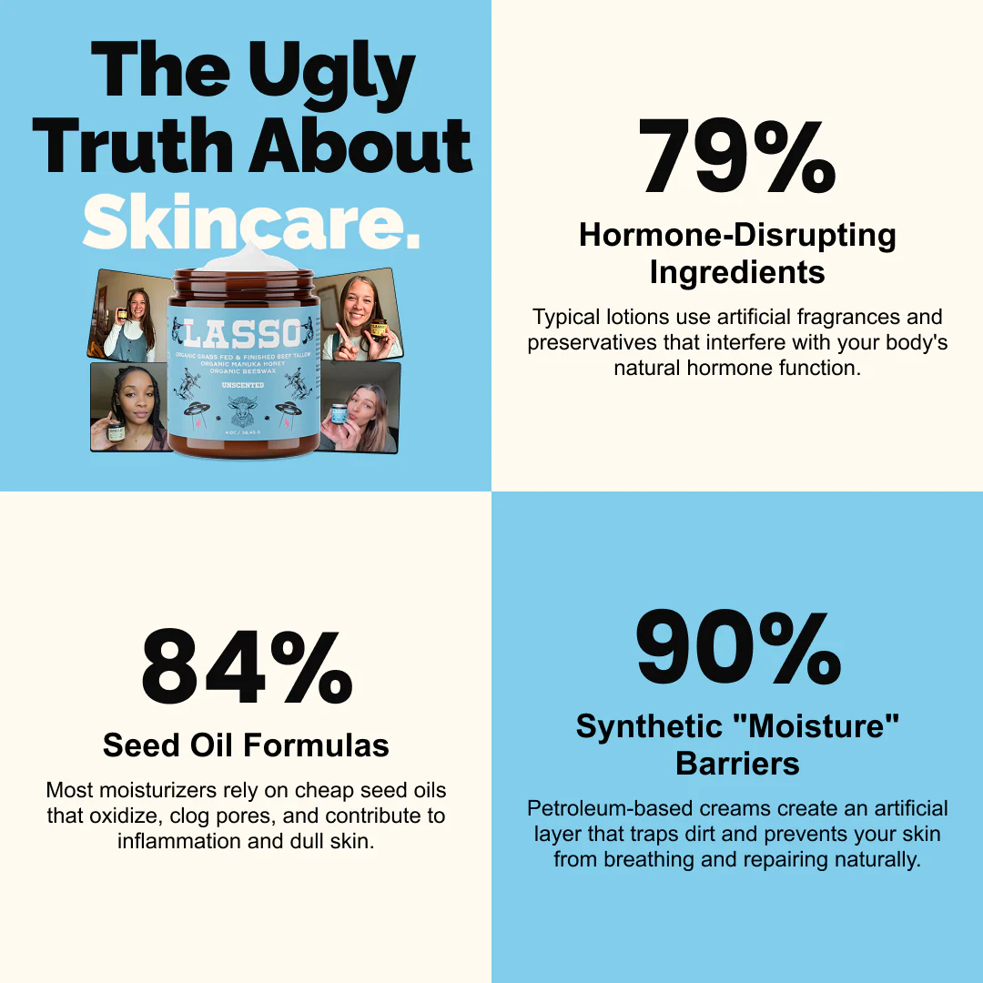 Most lotions and creams are filled with seed oils, parabens, toxic fragrances, and phthalates — chemicals that don’t just rest on your skin. They penetrate your bloodstream, mess with your hormones, and disrupt your body’s natural rhythm.